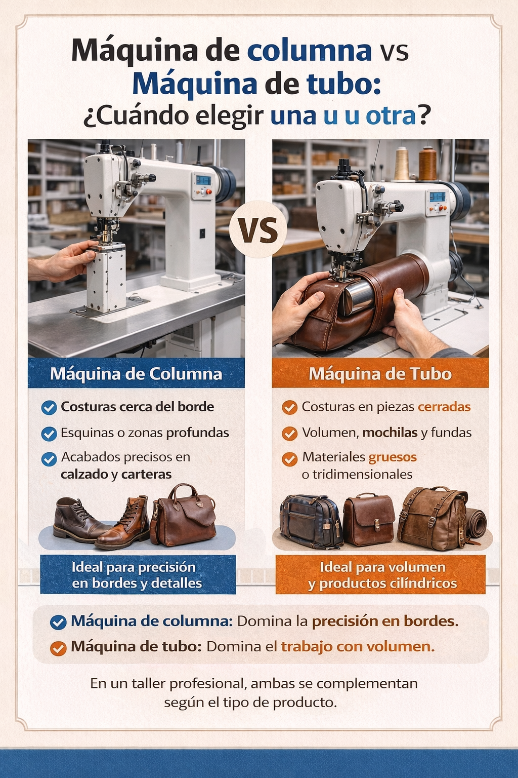Cuando un taller empieza a fabricar productos más complejos —como bolsos, mochilas, calzado o artículos de cuero— aparecen nuevas necesidades técnicas. La máquina plana deja de ser suficiente y surge la gran duda: